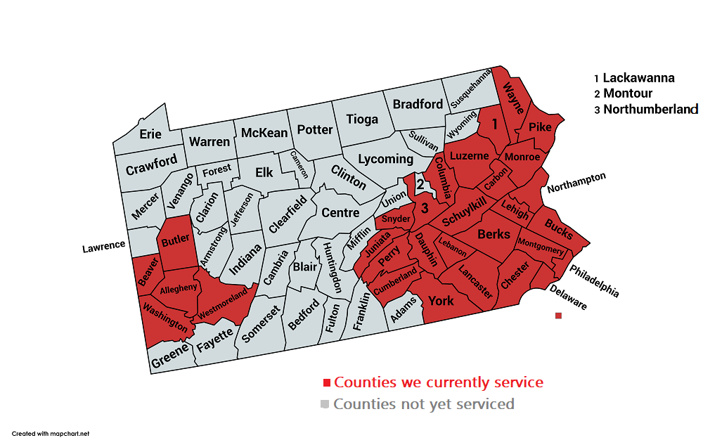 Our coverage range fully covers all of the following Pennsylvania counties: Berks County, Bucks County, Chester County, Dauphin County, Delaware County, Lancaster County, Lebanon County, Lehigh County, Montgomery County, Northampton County, Philadelphia County, and York County.